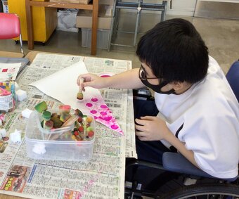 共同作品を制作中。スポンジを使って、色を付けています!
