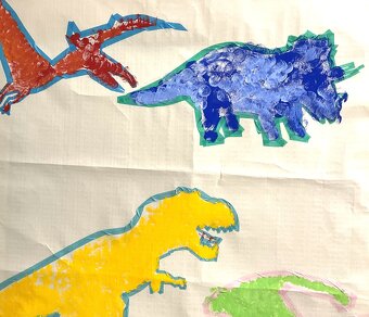 恐竜の絵を描いて、スポンジを使って色を付けました